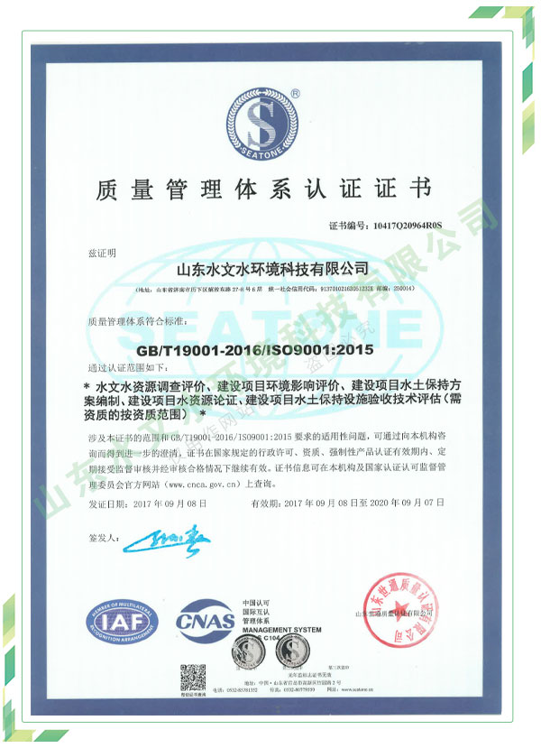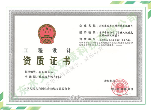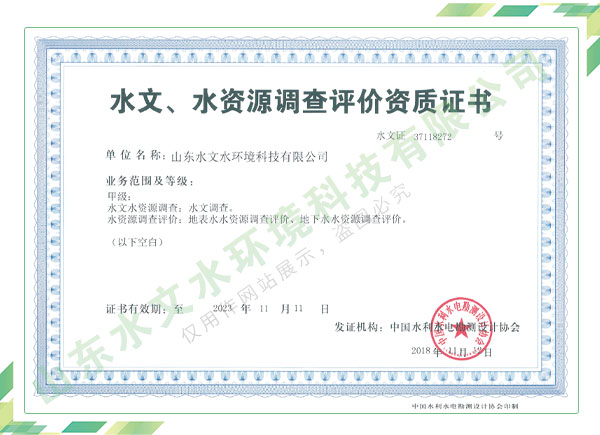 公司擁有水利工程設(shè)計(jì)、水土保持、水文水資源調(diào)查評價(jià)、水資源論證、建設(shè)項(xiàng)目環(huán)境影響評價(jià)、市政公用工程施工總承包、水利水電工程施工總承包、電子與智能化工程專業(yè)承包等資質(zhì),2017年通過質(zhì)量管理體系、環(huán)境管理體系、職業(yè)健康安全管理體系認(rèn)證;2020年被評為國家級(jí)高新技術(shù)企業(yè),同年被中國水利企業(yè)協(xié)會(huì)推薦為第一批“合同節(jié)水服務(wù)企業(yè)”;2021年被山東省、濟(jì)南市評為 “專精特新”中小企業(yè)。業(yè)務(wù)范圍涉及水利工程設(shè)計(jì);節(jié)水設(shè)計(jì)、改造、水平衡測試;山洪災(zāi)害調(diào)查;城市水資源調(diào)查評價(jià);建設(shè)項(xiàng)目水土保持方案編制、監(jiān)測、驗(yàn)收、水土保持規(guī)劃;水安全保障規(guī)劃、建設(shè)項(xiàng)目水資源論證、規(guī)劃水資源論證;建設(shè)項(xiàng)目環(huán)境影響評價(jià);入河排污口論證;防洪影響評價(jià);市政公用工程施工、水利水電工程施工、電子與智能化工程施工等。